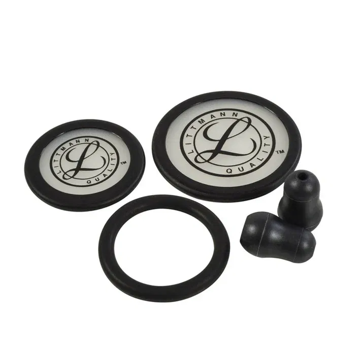 El kit de piezas de repuesto para estetoscopio Littmann para los estetoscopios Classic III™ y Cardiology IV™ contiene un diafragma ajustable de una sola pieza de color negro para los lados adulto y pediátrico del receptor de oídos, además de dos olivas pequeñas (1/2 pulgada) de color negro con sellado suave y cierre hermético.