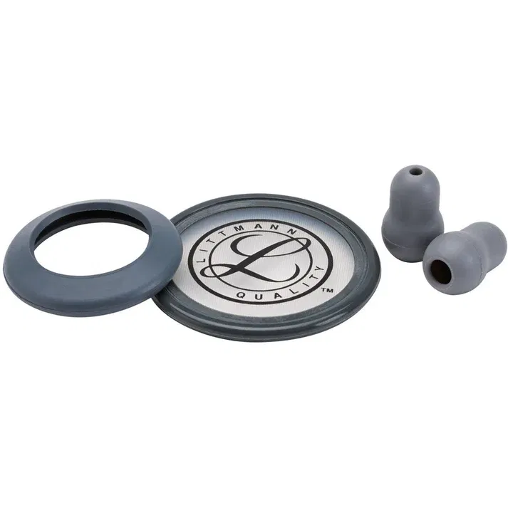 El kit de piezas de repuesto para el estetoscopio 3M™ Littmann® Classic II SE contiene un borde gris y un diafragma ajustable para el lado adulto de la pieza torácica y un borde gris antienfriamiento para el lado de campana de la pieza torácica. También se incluyen dos olivas pequeñas (1/2 pulgada) de color gris con sellado suave y hermético.