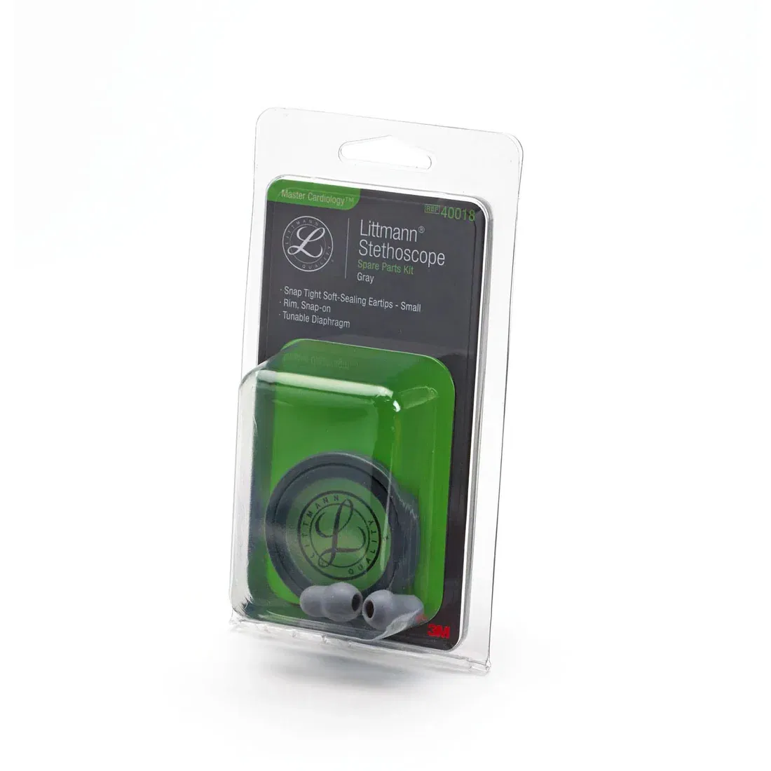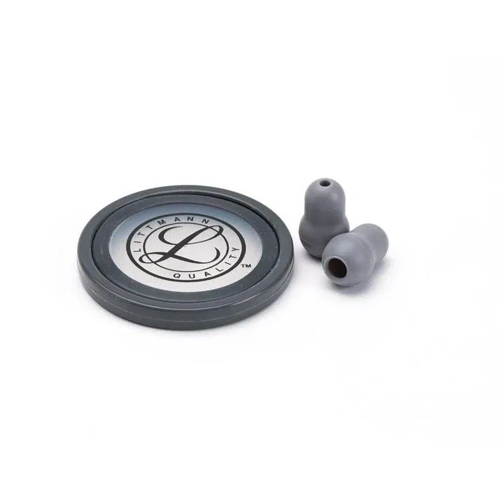 El kit de piezas de repuesto para el estetoscopio 3M™ Littmann® para el estetoscopio Master Cardiology™ contiene un borde gris y un diafragma ajustable para la pieza torácica, además de dos olivas pequeñas (1/2 pulgada) de color negro con sellado suave y cierre hermético.
